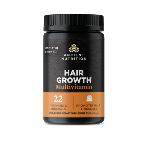 Ancient Nutrition Hair Growth Multivitamin container on a countertop with text about hair thickness and growth.