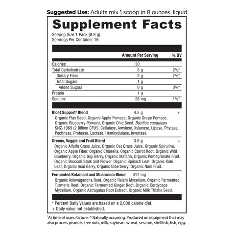 Our best-selling greens are now updated specifically for bloat relief†. Get 25 organic greens, fruits, herbs and mushrooms as well as a science-backed blend of probiotics, prebiotics and digestive enzymes to support your gut health and relieve digestive discomfort in as little as 30 days†.